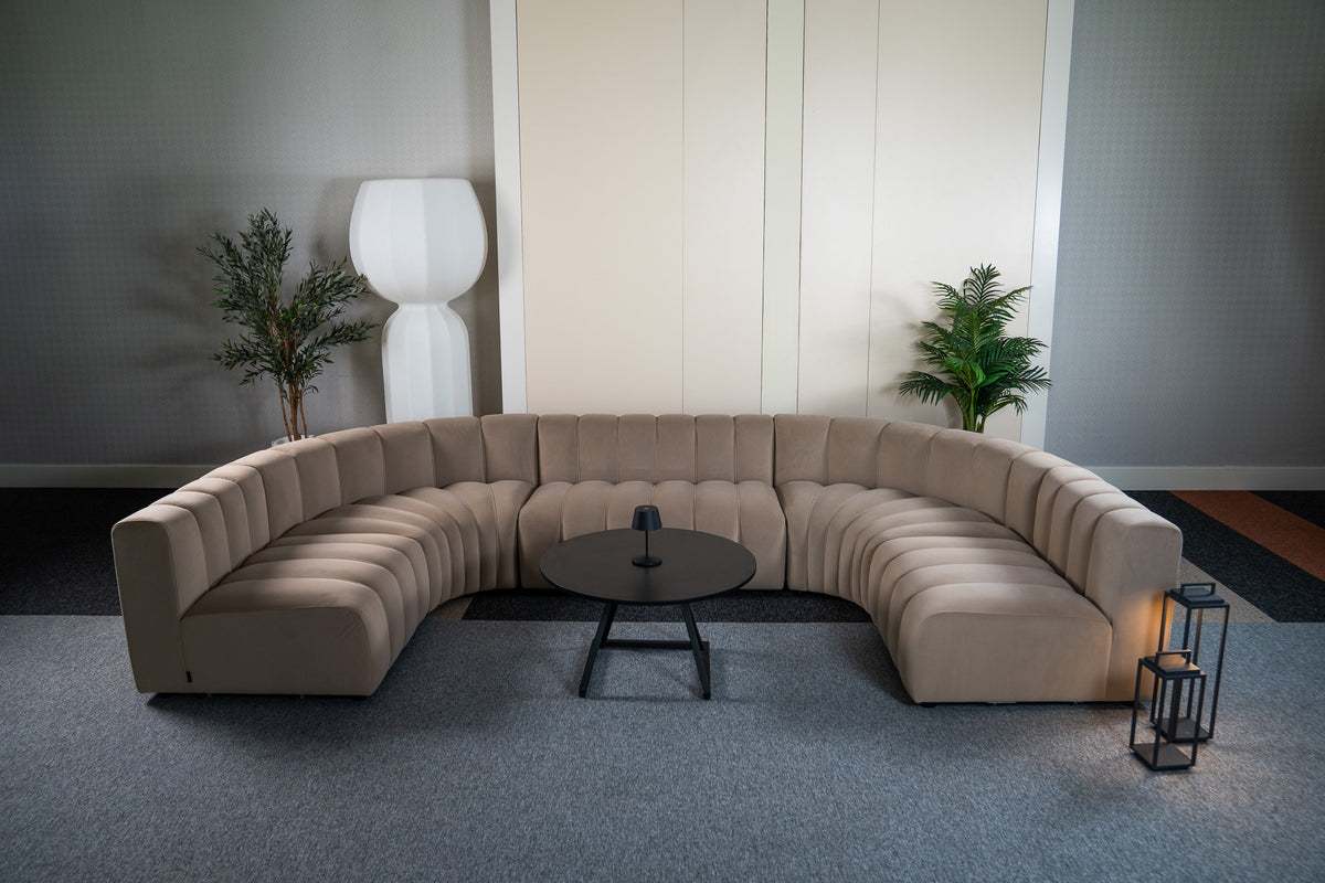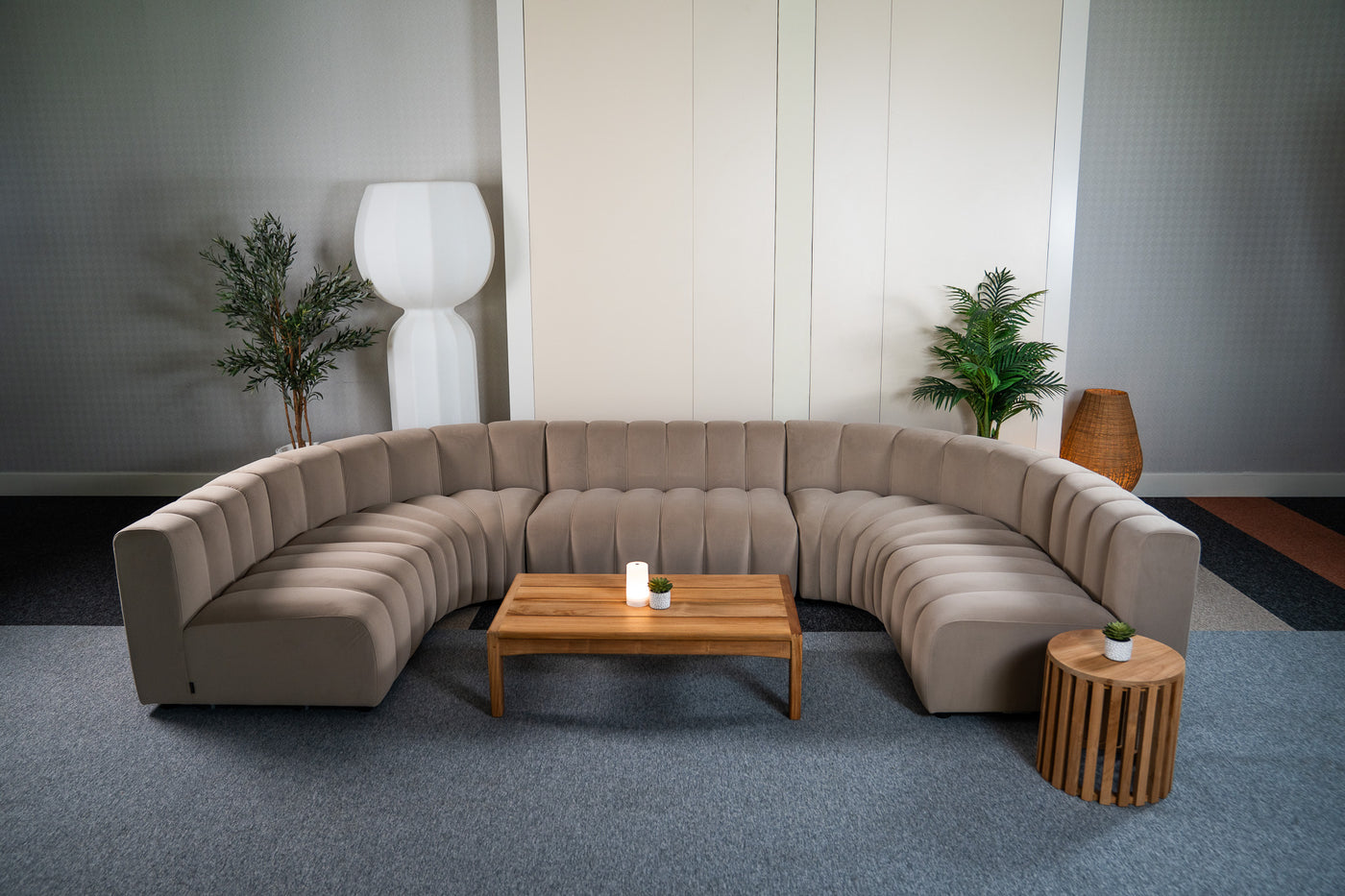 A contemporary reinterpretation of 1970s lounge style, combining bold fluted upholstery with modular comfort.