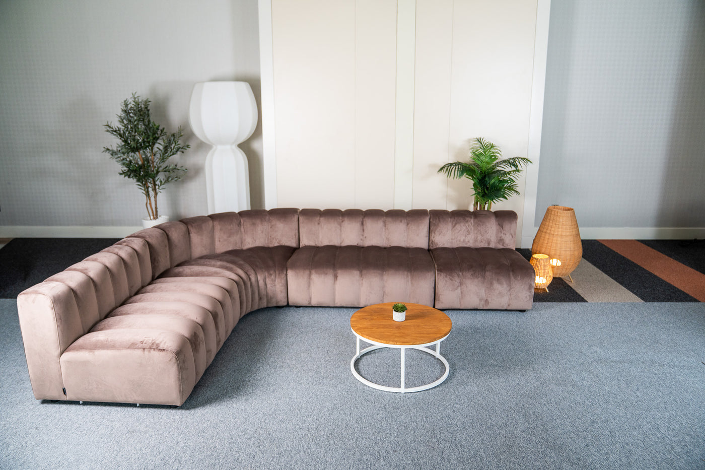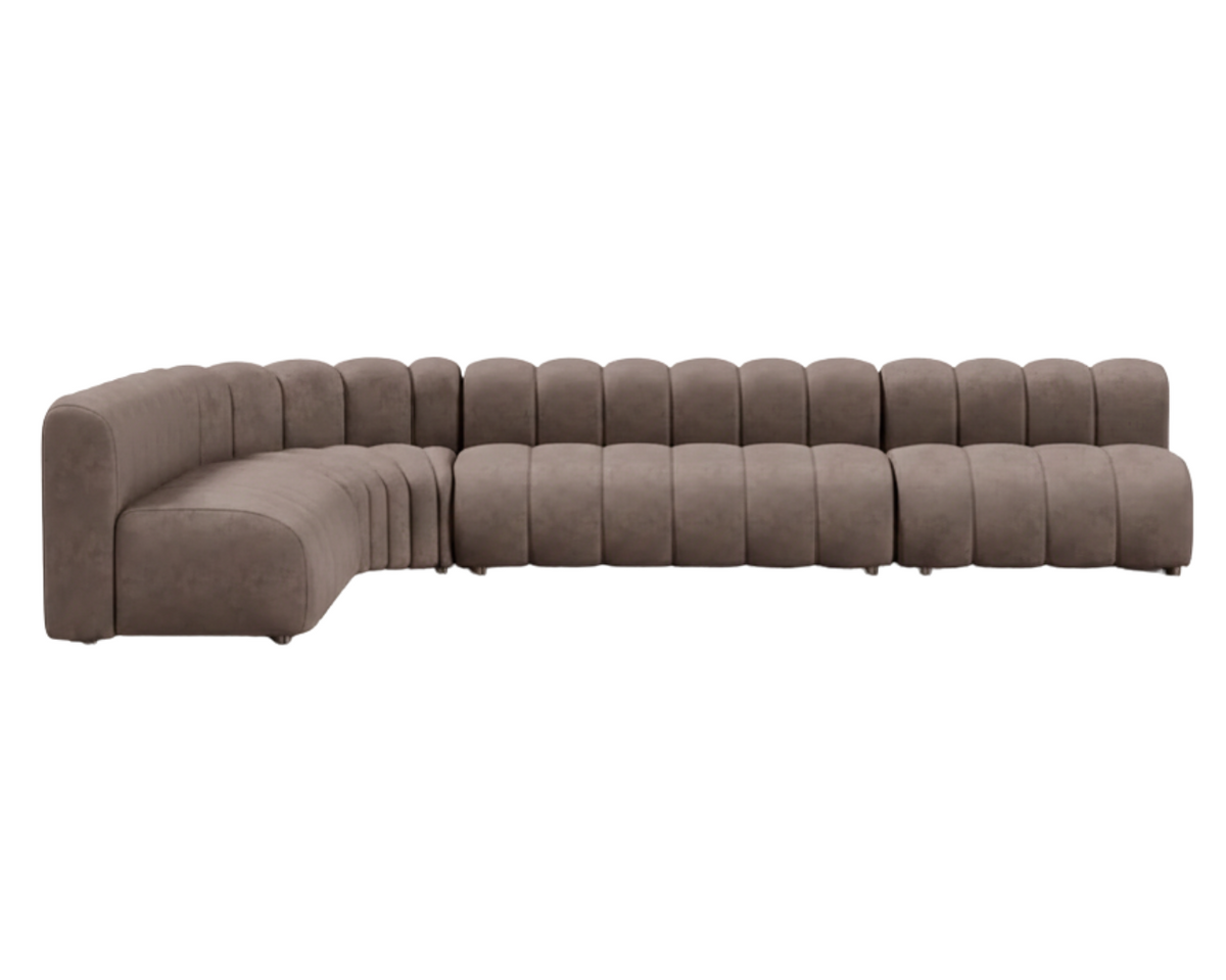 A contemporary reinterpretation of 1970s lounge style, combining bold fluted upholstery with modular comfort.