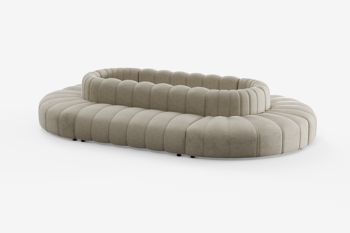 A contemporary reinterpretation of 1970s lounge style, combining bold fluted upholstery with modular comfort.