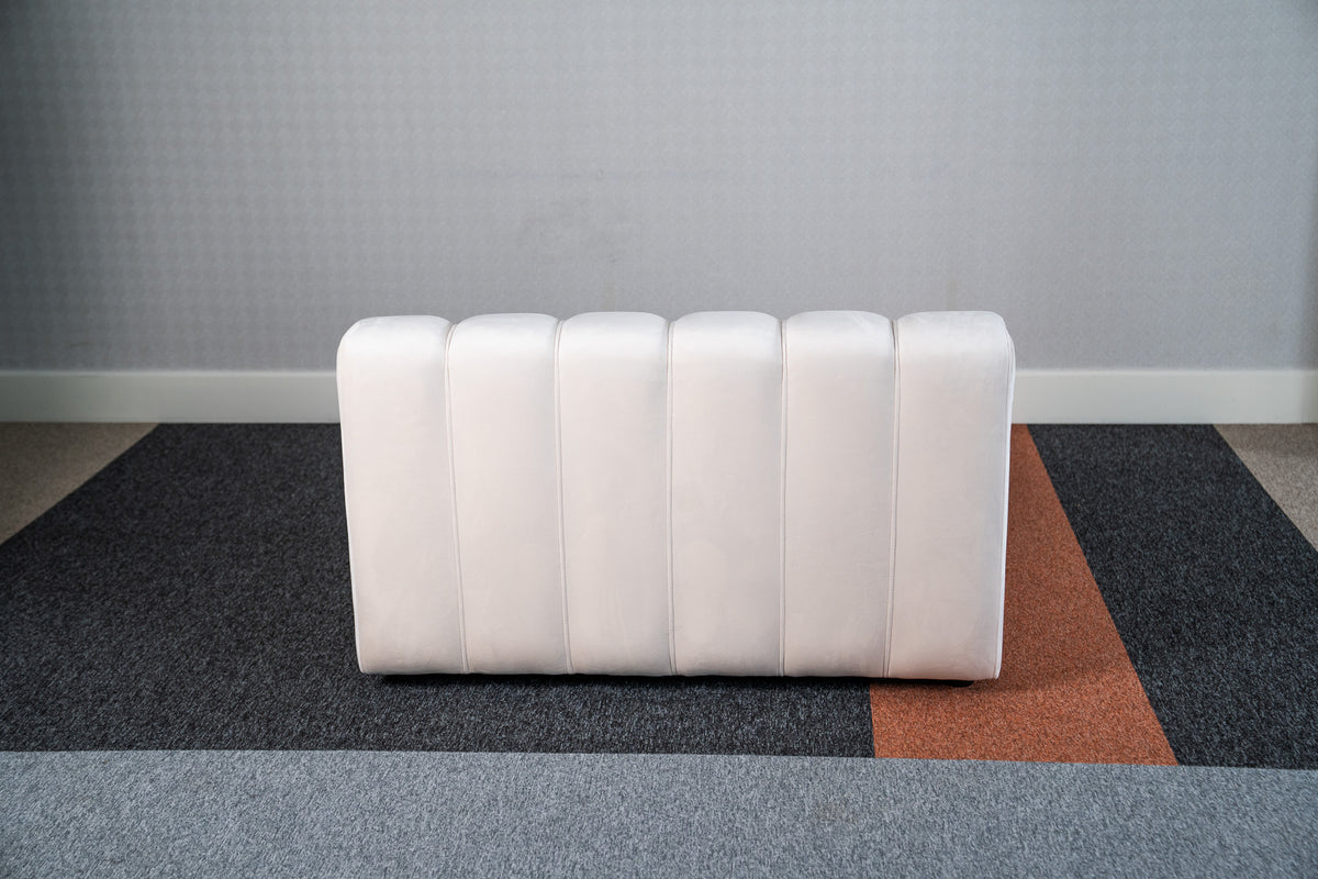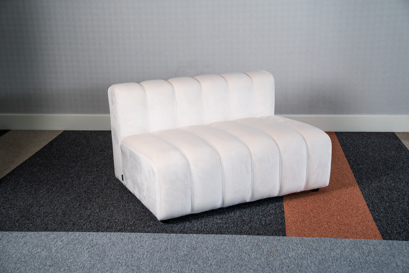 A contemporary reinterpretation of 1970s lounge style, combining bold fluted upholstery with modular comfort.