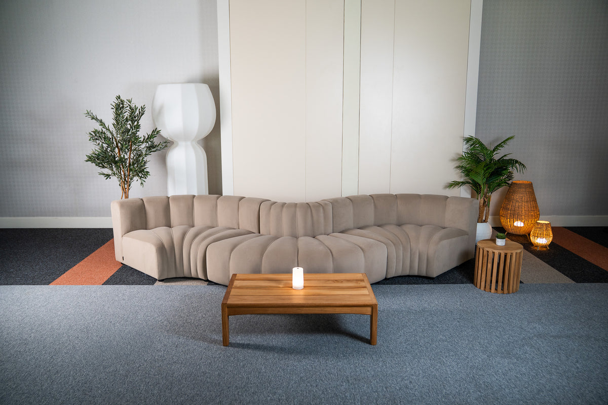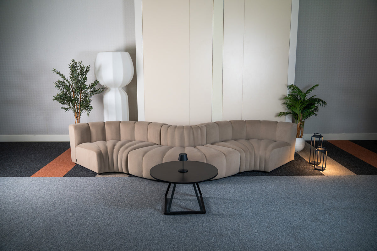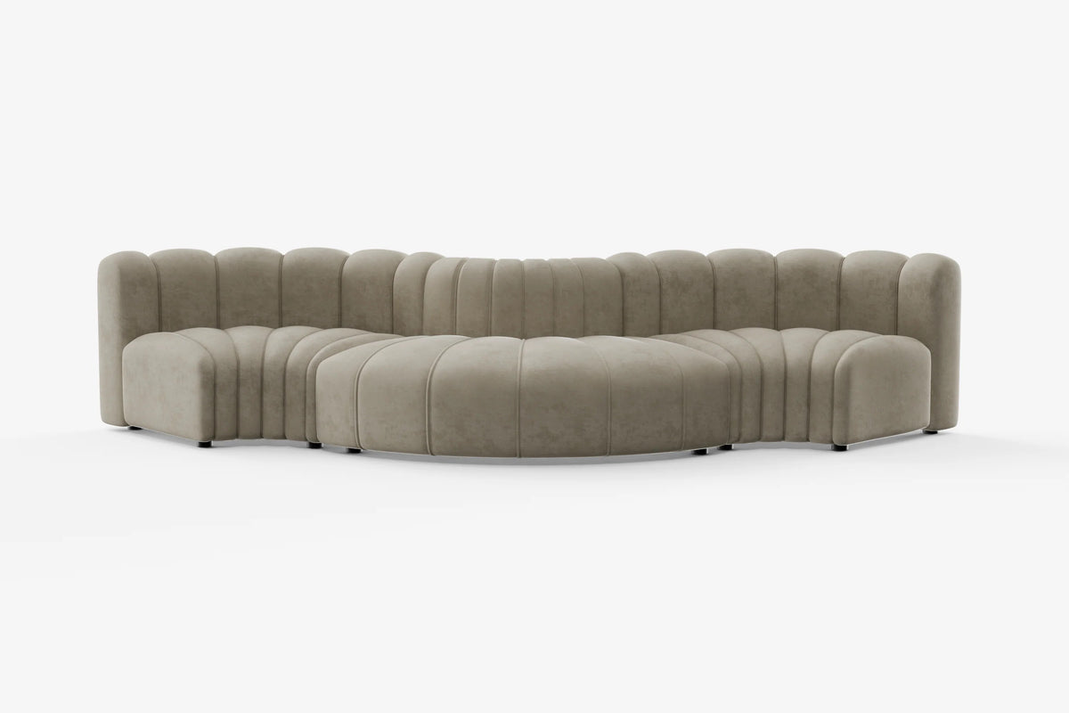 A contemporary reinterpretation of 1970s lounge style, combining bold fluted upholstery with modular comfort.