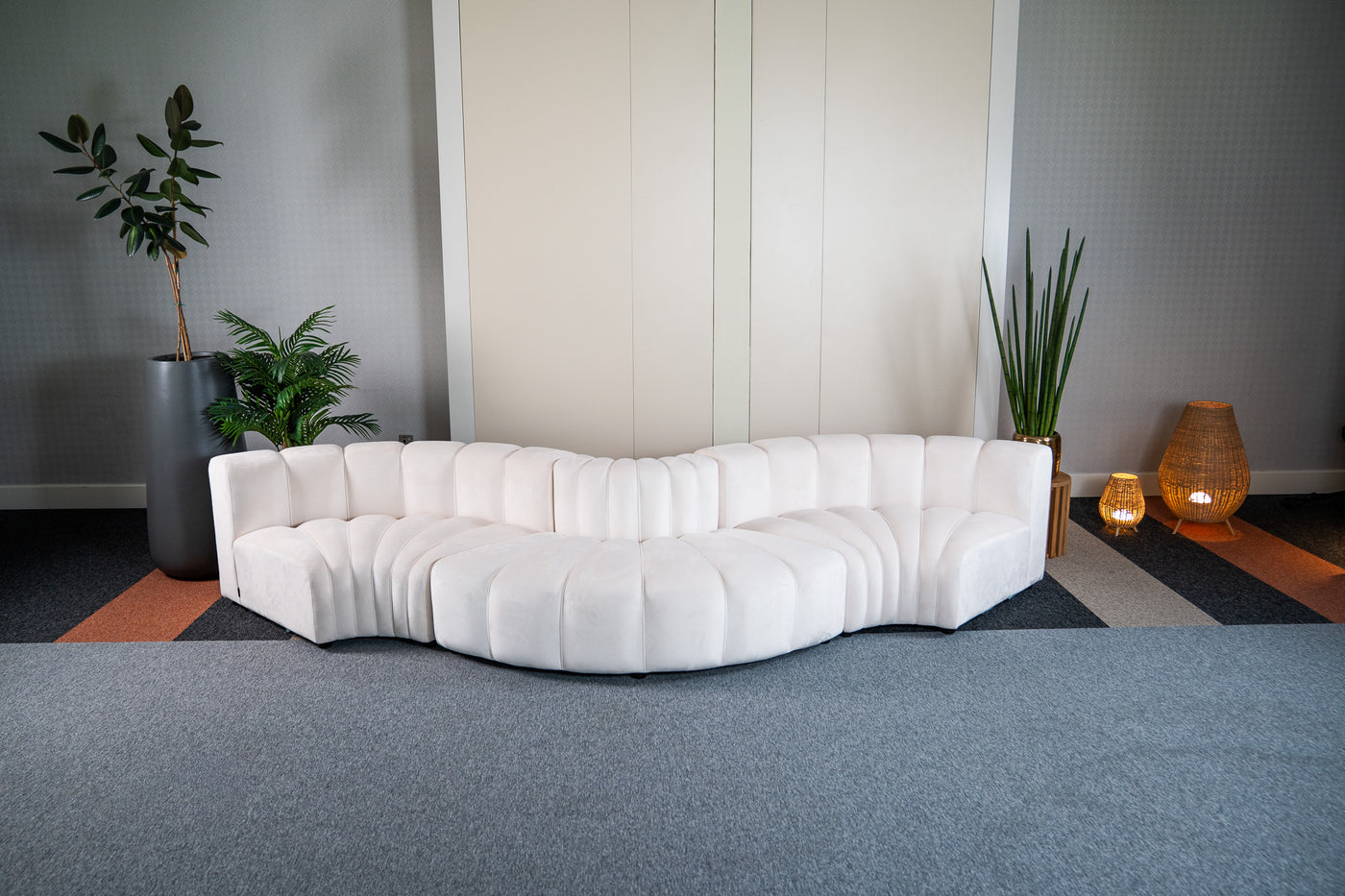 A contemporary reinterpretation of 1970s lounge style, combining bold fluted upholstery with modular comfort.