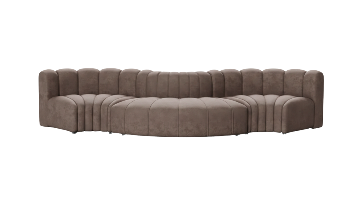 A contemporary reinterpretation of 1970s lounge style, combining bold fluted upholstery with modular comfort.